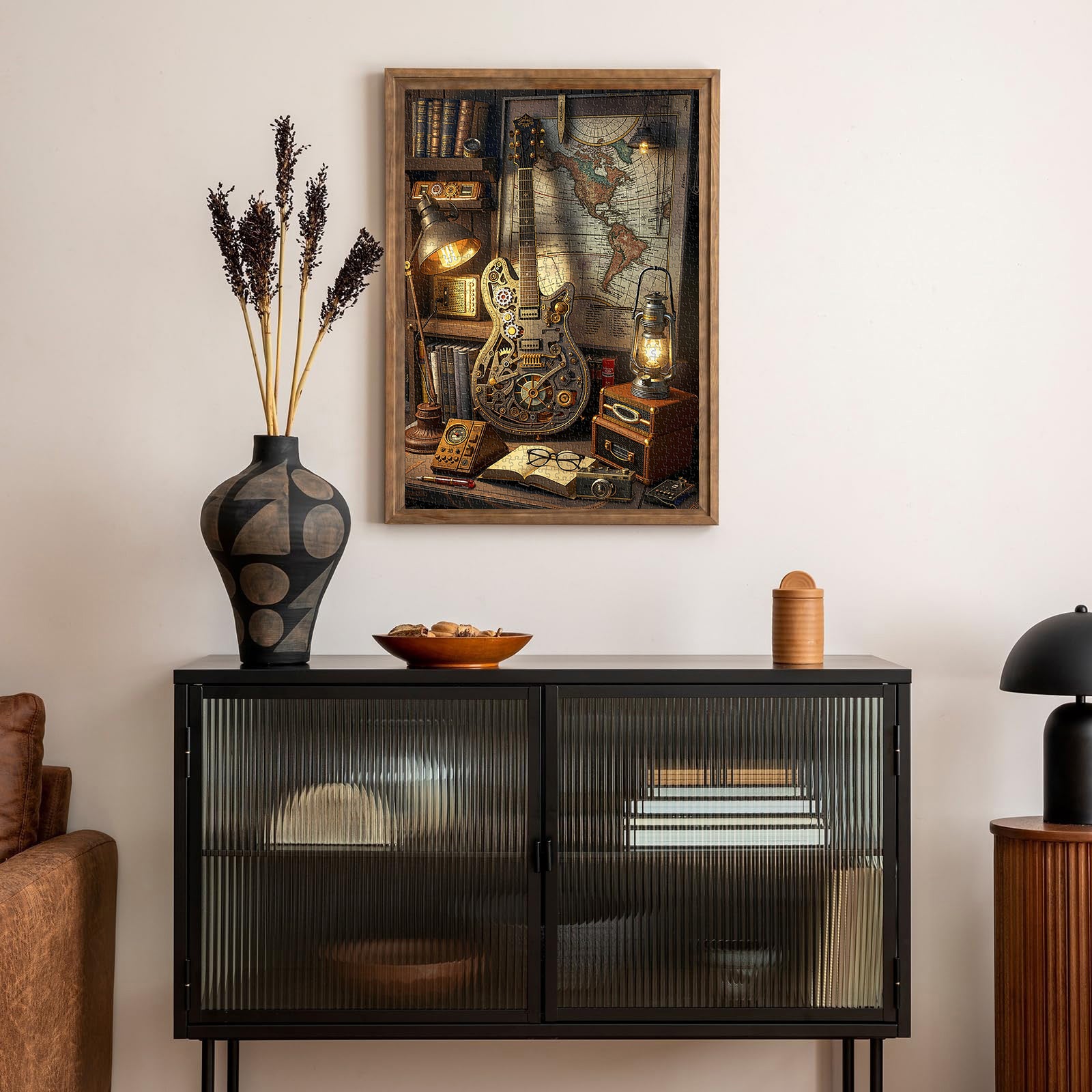 ⚙️Mechanical Sonata Jigsaw Puzzle: 🎸A geared guitar gleams with a metallic shimmer, a vintage map holds untold journeys, and a kerosene lamp and old books interweave to create the romance of the industrial age. 🎵This is a fantastical scene that blends mechanical aesthetics, musical fervor, and the spirit of adventure. It's as if you can hear the symphony of churning gears and twanging guitar strings.