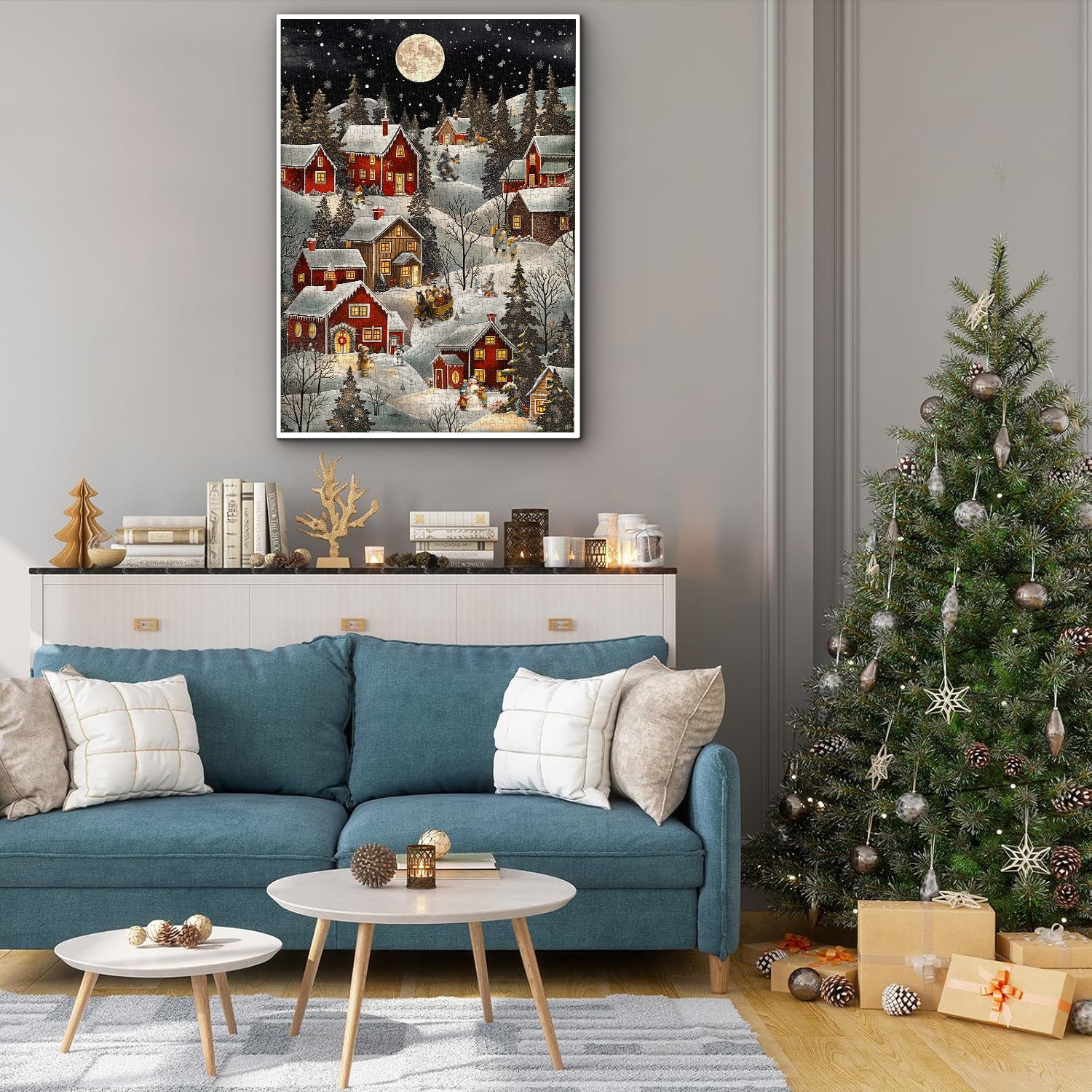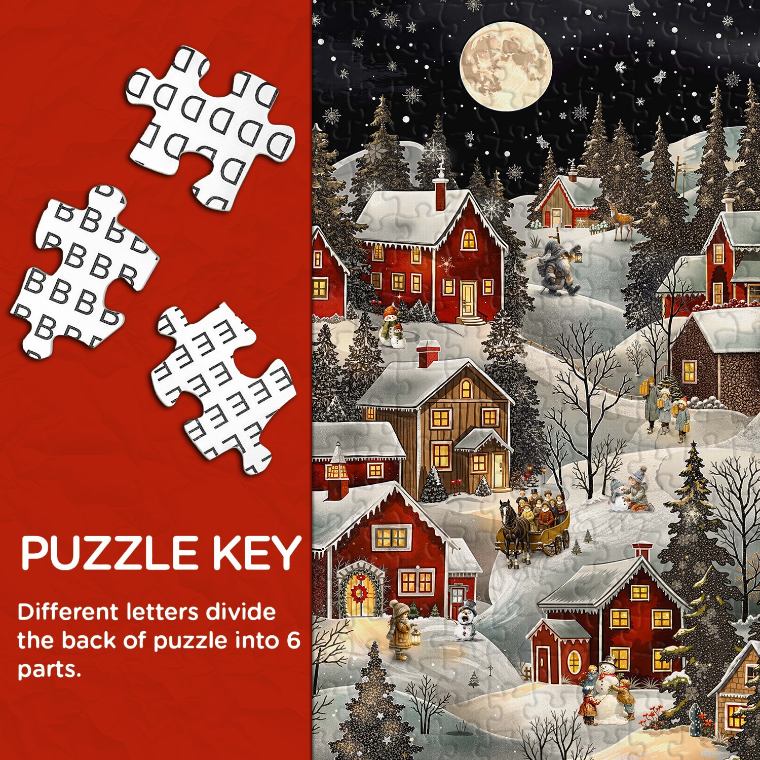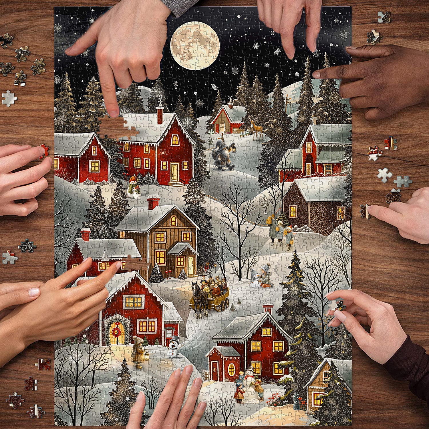 🏘️❄️Snowy Night Town Jigsaw Puzzle: As silver snow blankets the red-roofed cottage, a full moon hangs in the inky night sky, carriages jingle in the snow, and warm light streams through the windows. ☃️Snowmen and elves frolic in the snowdrifts. Every puzzle piece is a "Christmas piece"!