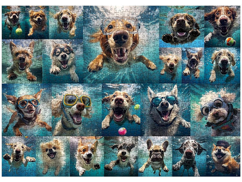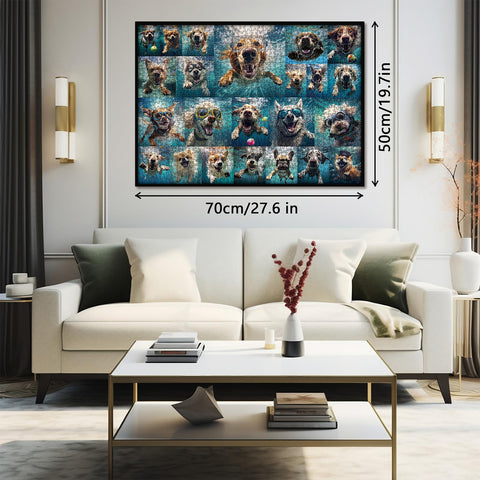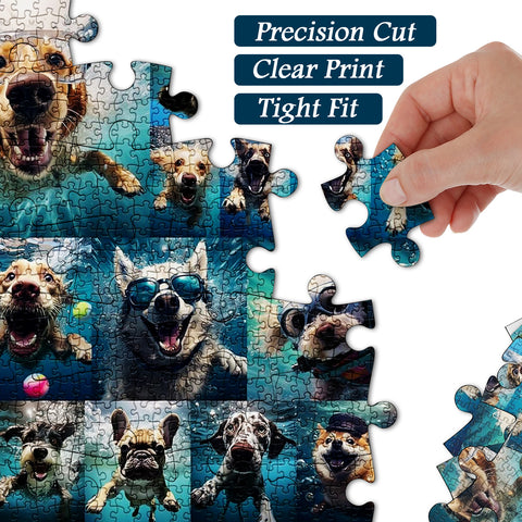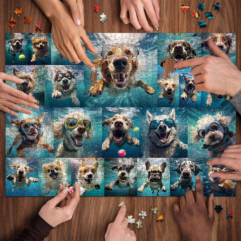 Funny Underwater Dog Puzzle 1000 pieces: Dive into joy with our whimsical underwater jigsaw featuring a delightful array of dogs swimming, each exuding charming expressions. Perfect for a playful touch at home!